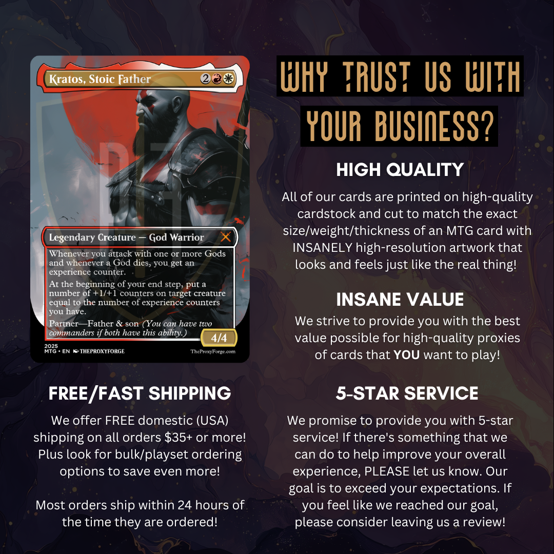 Premium Black Core Cardstock:Â Engineered for durability, our proxies are printed on high-quality black core cardstock, delivering a premium feel and ensuring these cards withstand the rigors of intense gameplay.