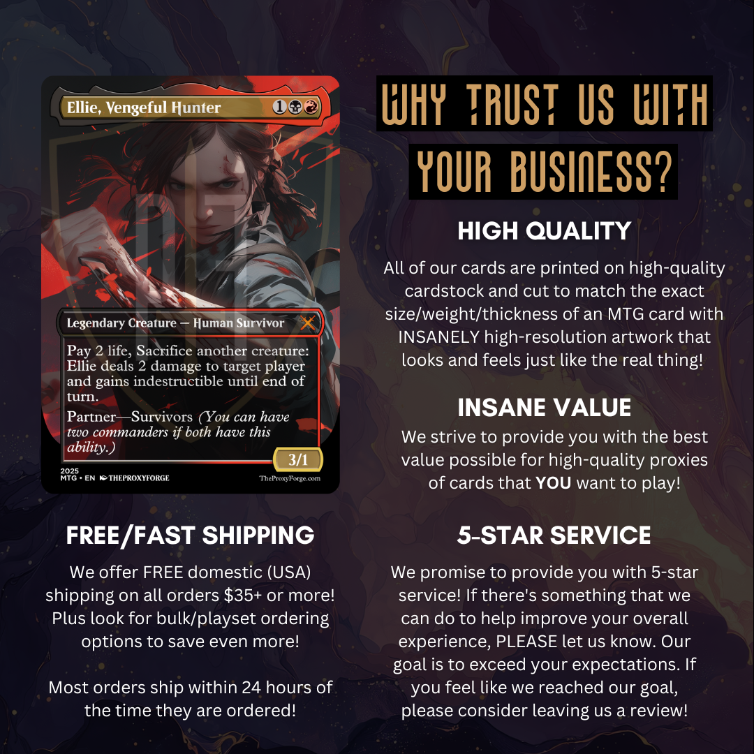 Premium Black Core Cardstock:Â Engineered for durability, our proxies are printed on high-quality black core cardstock, delivering a premium feel and ensuring these cards withstand the rigors of intense gameplay.