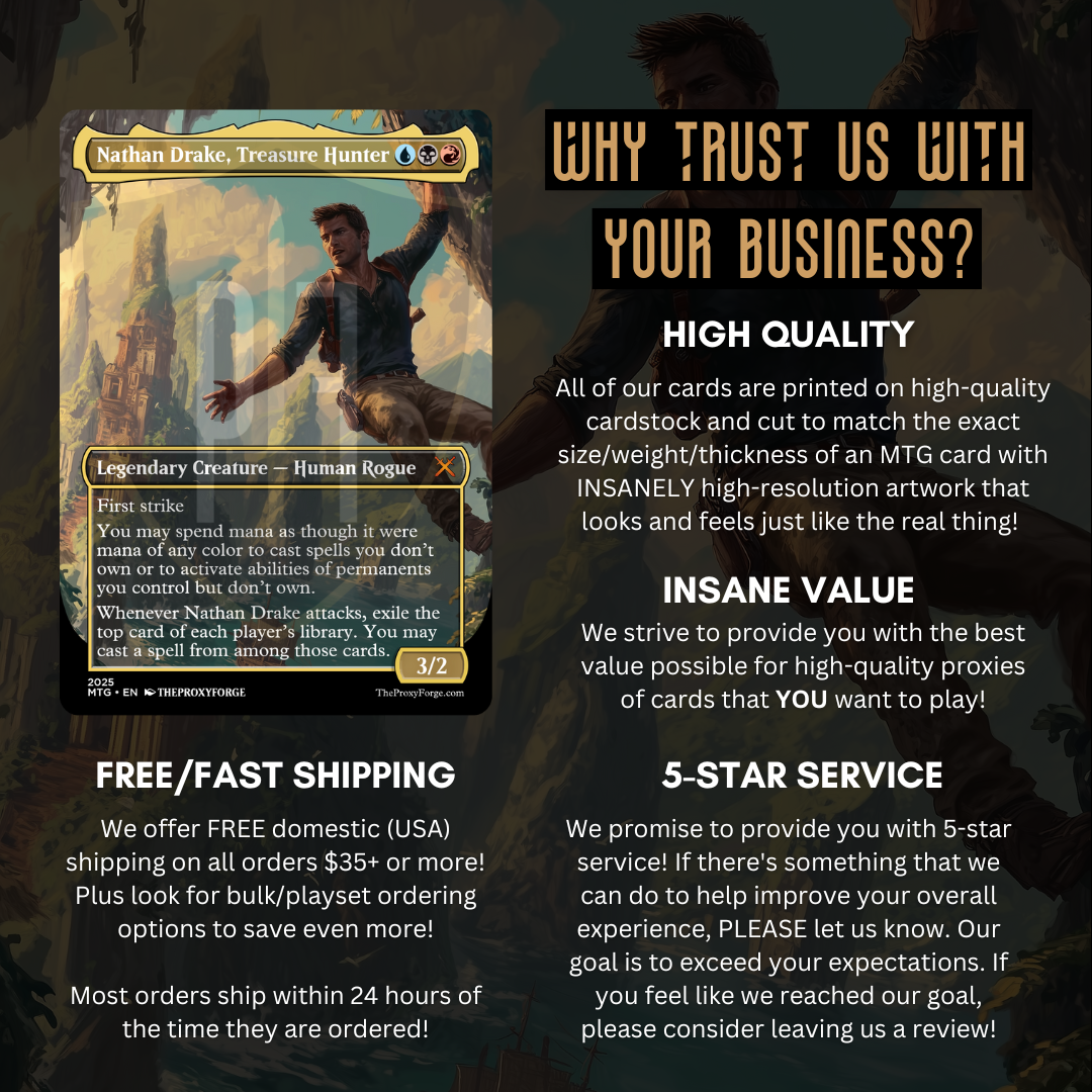 Versatility in Use:Â Our proxies are designed to seamlessly integrate into various MTG gaming environments. Elevate your game nights and casual matches with the visually striking and strategically impactful presence of our high-quality MTG Proxy cards.